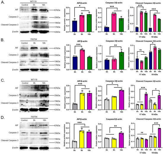 S. suis induces caspase- and p53-dependent apoptosis in PAM cells. PAM-Tang cells were infected with (A) S. suis avir-W7119 or (B) S. suis vir-700794, and primary PAMs were infected with (C) S. suis avir-W7119 or (D) S. suis vir-700794 at an MOI = 1 for 0, 9, and 16 h. The cell lysates were collected, levels of proteins related to apoptotic functional indexes: caspase-3, cleaved-caspase-3, and AIF were determined by Western blot and analyzed digitally, and the optical density ratio was calculated. Three identical graphics represent three independent wells in a single experiment, and experiments were repeated three times; the results are expressed as means ± S.D, significance was determined using one-way ANOVA multiple-comparison test; ns: not significant; *: p < 0.05; **: p < 0.01; ***: p < 0.001.