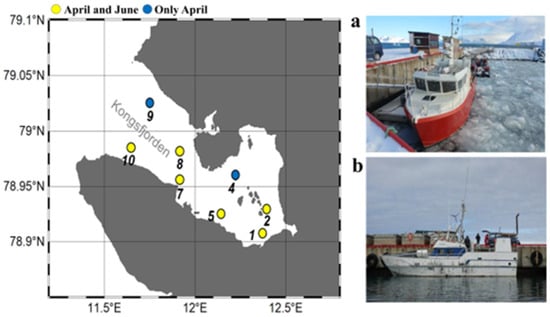 Sampling locations in the Sub–Arctic Kongsfjorden in April and June 2018. A total of eight sampling sites (St.) were investigated at St. 1, 2, 4, 5, 7, 8, 9, and 10 (April 2018) and St. 1, 2, 5, 7, 8, and 10 (June 2018) for environmental factor measurements. Sub-sampling was also conducted at St. 1, 5, 7, 8, and 10 (April 2018) and St. 1, 8, and 10 (June 2018) to analyze nucleocytoplasmic large DNA viruses (NCLDVs) and the eukaryotic plankton community (EPC). Floating drift ice was observed in April (a), but not in June (b) due to the increase in water temperature.