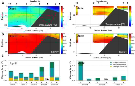 We found the mean salinity and water temperature in April to be 30 and 0 °C, respectively, in their vertical distributions (Figure 2a,b). The chlorophyll-a concentration in April was uniformly distributed at <0.1 μg L−1 across all measured data (Figure 2c). In June, the mean water temperature increased to 2 °C, while that of salinity decreased to 28 in the surface layer, implying that the salinity of the surface layer was affected by sea ice or glacial meltwater. The chlorophyll-a concentration in the surface layer adjacent to the inner bay (St. 1) was relatively high at 1.2 μg L−1, however, at the other sampling sites was <0.3 μg L−1.