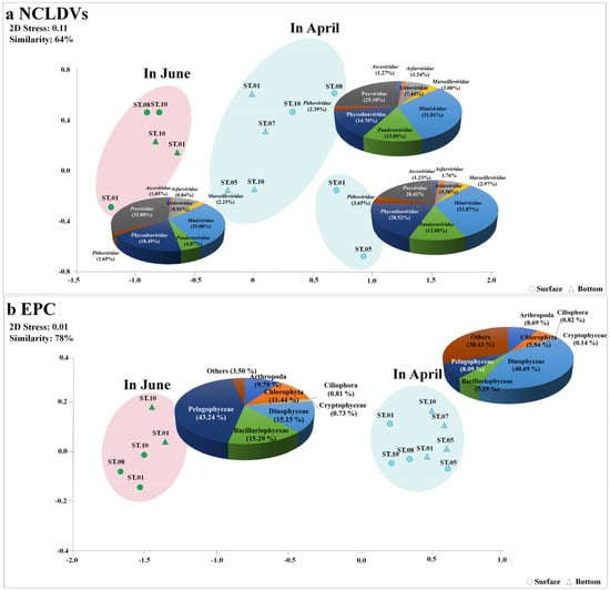 Non–metric multidimensional scaling (NMDS) plot in nucleocytoplasmic large DNA viruses (NCLDVs) (a) and the eukaryotic plankton community (EPC) (b) in the Sub–Arctic Kongsfjorden in April and June 2018. A total of eight sites were investigated during the cruises. The NMDS plot was analyzed using the Bray–Curtis dissimilarity method. All data were normalized by the fourth roots. The pie charts indicate the high–ranking taxonomic distribution at the family level for NCLDVs and the phylum (or class) level for the EPC.