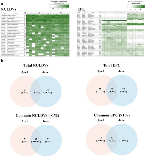 The NCLDVs in April and June comprised 413 taxa and 437 taxa, respectively, of which, 78.1% (411 taxa) were common to both sampling time points. However, only 28 NCLDV taxa with a mean relative abundance > 1% were common in all samples and overlapped by 10% between April and June (Figure 4b). Of these common NCLDV taxa, 17 were relatively increased in April compared to June, while 11 taxa decreased in June. In particular, Mimivirus terra2 (vOTU#75, Mimiviridae), Pandoravirus neocaledonia (vOTU #102, Pandoraviridae), Pandoravirus macleodensis (vOTU #101, Pandoraviridae), and Cotia virus SPAn232 (vOTU #29, Poxviridae) rapidly decreased in June, while Acanthamoeba polyphaga moumouvirus (vOTU#17, Mimiviridae), Orpheovirus IHUMI-LCC2 (vOTU#90, Phycodnaviridae), Megavirus chiliensis (vOTU#2, Mimiviridae), Chrysochromulina ericina virus (vOTU#26, Mimiviridae), and Emiliania huxleyi virus (vOTU#39, Phycodnaviridae) rapidly increased in June.