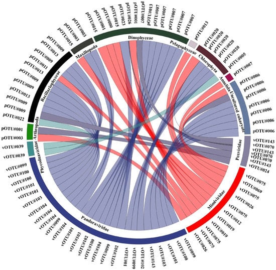 Bivariate Pearson correlations were performed to assess the correlations between common NCLDVs and EPC lineages with a mean relative abundances of >1%. Using this threshold (p < 0.05), 48 common NCLDV–EPCs lineage pairs were identified with strong significant positive correlation coefficients (r > 0.5, Figure 5, Table S6). The NCLDV lineages were significantly correlated with a known host group of Dinophyceae (r = 0.65, p = 0.01). Among the NCLDVs, five Mimiviridae vOTUs (Mimivirus terra2 [vOTU#75], Megavirus chiliensis, [vOTU#69], Aureococcus anophagefferens virus, [vOTU#12], Cafeteria roenbergensis virus BV-PW1 [vOTU#19], and Chrysochromulina ericina virus [vOTU#26]) was significantly correlated with nine EPC taxa (Aureococcus anophagefferens [pOTU#0], Calanus finmarchicus [pOTU#1], Nephtys pente [pOTU#11], Chaetoceros sp. [pOTU#13], Polarella glacialis [pOTU#15], Gyrodinium helveticum [pOTU#7], Uncultured Prasinophyceae [pOTU#20], Copepoda environmental [pOTU#3], Uncultured eukaryotes [pOTU#6]). One vOTU of Phycodnaviridae (Emiliania huxleyi virus 86 [vOTU#39]) and five vOTUs of Pandoraviridae (Pandoravirus inopinatum [vOTU#100], Pandoravirus macleodensis [vOTU#101], Pandoravirus salinus [vOTU#104], Pandoravirus neocaledonia [vOTU#102], and Pandoravirus dulcis [vOTU#99]) were significantly correlated with two (Thalassiosira sp. [pOTU#13] and Pyramimonas australis [pOTU#5]) and seven EPC pOTUs (Chaetoceros sp. [pOTU#13], Navicula cari [pOTU#9], Gyrodinium helveticum [pOTU#7], Polarella glacialis [pOTU#15], uncultured Prasinophyceae [pOTU#20], uncultured copepod [pOTU#3], and uncultured eukaryote [pOTU#6]), respectively. Two vOTUs of Poxviridae (Melanoplus sanguinipes entomopoxvirus [vOTU#70] and Choristoneura biennis entomopoxvirus [vOTU#240)] were significantly correlated with three pOTUs (Heterocapsa rotundata [pOTU#26], Karlodinium venefium [pOTU#23], and Calanus finmarchicus [pOTU#1]). Other families, including one vOTU of Pithoviridae (Pithovirus sibericum [vOTU#117]) and one vOTU of Asfaviridae (African swine fever virus [vOTU#6]) were each significantly correlated with one pOTU (uncultured Prasinophyceae [pOTU#20] and Oithona similis [pOTU#4]), respectively.