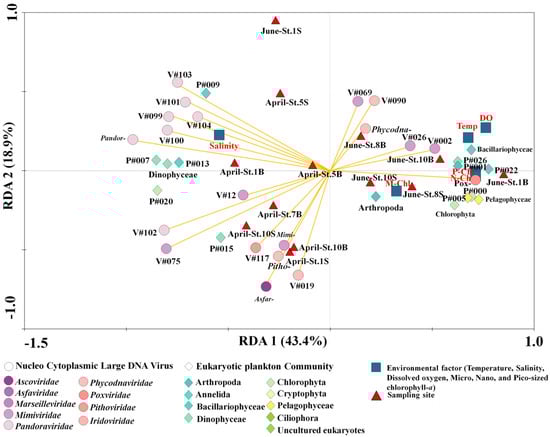 The RDA biplot in Figure 6 and Table S4 was analyzed to explain the relative importance of the variables between the NCLDVs and EPCs (F value: 5.73, p = 0.0001). The NCLDV families-common EPC, including environmental relationships represented in the plot, included six common families and 14 common NCLDV taxa and 21 common variables, including EPC phylum (or class level) and environmental factors that accounted for 43.4% (first axis) and 18.9% (second axis). More specifically, Asfarviridae, Mimiviridae, Pandoraviridae, and Pithoviridae were primarily distributed with salinity in April. In particular, most Pandoraviruses were strongly associated with Gyrodinium helveticum and Dinophyceae. In June, Phycodnaviridae and Poxviridae formed a cluster of sampling sites (Figure 6). Moreover, specific NCLDVs (particularly Poxviridae and Phycodnaviridae) were associated with each size-fractionated chlorophyll-a concentration, temperature, and Pelagophyceae. The two clusters reflect the succession of other phytoplankton communities that respond to the distinguished NCLDVs.