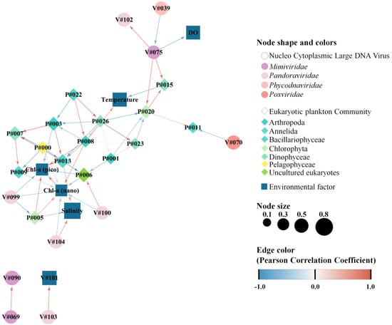 Network analysis showing the co–occurrence between common nucleocytoplasmic large DNA viruses (NCLDVs) and the eukaryotic plankton community (EPC), represented as blue and beige nodes, respectively. Lines between nodes indicate positive (blue) and negative (red) PCC correlation > |0.5| (two–sided pseudo p–value < 0.05) between the abundances of linked taxa. Detailed information (species names of operational taxonomic unit [OTU] numbers and correlation coefficients) is described in Table S7.