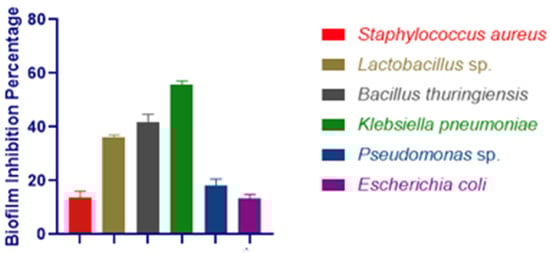 Biofilm inhibition by the CFS from Staphylococcus aureus, Lactobacillus sp., Bacillus thuringiensis, Klebsiella pneumoniae, Pseudomonas sp. and Escherichia coli.