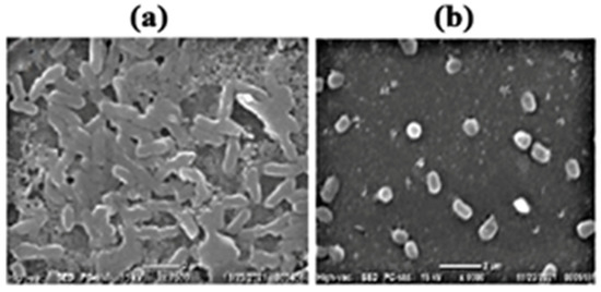 Representative scanning electron micrographs showing biofilm disruption on glass surfaces: (a) biofilm formed by Aeromonas sp.; (b) biofilm disruption by co-incubation with 100 µL of CFS form Klebsiella pneumoniae and bacterial culture of Aeromonas sp.