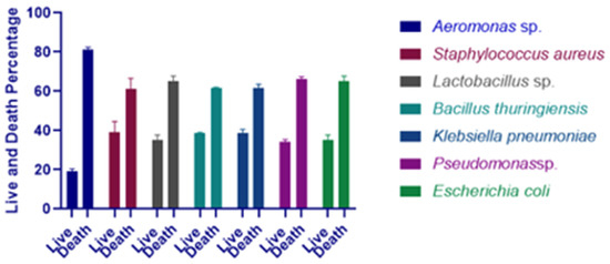 After an experimental infection with bacterial strains Aeromonas sp., Staphylococcus aureus, Lactobacillus sp. Bacillus thuringiensis, Klebsiella pneumoniae, Pseudomonas sp., Escherichia coli at a concentration of 5.4 × 106 CFU/mL, all of the Artemia larvae (ten cysts of Artemia salina used for treatment) died within forty-eight hours of infection. No Artemia salina perished after six hours of infection with pathogenic bacteria (concentration 5.4 × 106 CFU/mL). After twenty-four hours of infection with those bacteria, the mortality rate was 81%, 61, 65%, 61.5%, 61.5%, and 66%, respectively (Figure 3). Hence, Aeromonas sp. was chosen as the most pathogenic bacterium for Artemia in the next study.