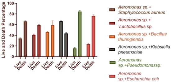 Antibiotic resistance is outpacing the discovery and development of new antibiotics, and the incidence of bacterial diseases that are wholly untreatable with currently available antibiotics has highlighted the ramifications of widespread antibiotic abuse. As a result, it is critical to use alternatives to the available antibiotics [61]. Microbial control of those pathogens may be an alternative method of control [62]. Antimicrobials may be used to treat infected fish as well as a preventative precaution, in addition to disinfectants and biocides. For this reason, in vitro and in vivo antagonistic tests were carried out to identify potential candidates, and in both assays, Klebsiella pneumoniae was found to have potential antagonistic efficacy. The in vivo test was carried out in brine shrimp nauplii, belonging to crustaceans, as they are considered a model organism due to physiological similarities with other crustaceans and toxicity testing [63,64]. When Artemia salina was treated with Aeromonas sp. and Klebsiella pneumoniae, its survival rate increased to around 50% (Figure 4). Similar in vivo tests were carried out by Faseela Hamza, who employed Artemia salina to determine the bacteria’s pathogenicity [65].