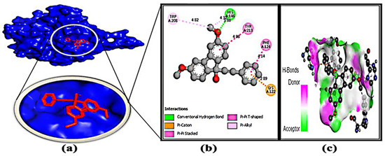 Docking simulation between protein–ligand interactions of nucleosidase (MTAN) enzymes and fluoren-9-ol, 3,6-dimethoxy-9-(2-phenylethynyl)-, respectively, with (a) cartoon view (binding pocket), (b) 2D view, and (c) hydrogen bonding.