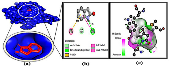 Docking simulation between protein–ligand interactions of nucleosidase (MTAN) enzymes and 2H-indol-2-one, 1,3-dihydro-, respectively, with (a) cartoon view (binding pocket), (b) 2D view, and (c) hydrogen bonding.