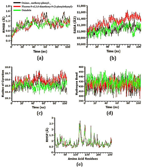 The structural stability of the docked ligand–protein complexes was investigated using molecular dynamics simulations. To explain variations in the protein–ligand complex’s stability, the RMSD of the C-alpha atoms from simulated trajectories was calculated. According to Figure 5, Figure 6 and Figure 7, the ligand–protein complexes involving oxime-, methoxy-phenyl-, fluoren-9-ol, 3,6-dimethoxy-9-(2-phenylethynyl)-, and oxindole showed an initial upward RMSD trend, which suggests the ligand–protein complexes were flexible. The oxindole-MTA/SAH nucleosidase complex’s RMSD profile dropped dramatically after around 40 ns, then steadied at 50 ns, and remained stable for the last 50 ns of the simulations, with only minor fluctuations. At 35–55 ns, the fluoren-9-ol, 3,6-dimethoxy-9-(2-phenylethynyl)-MTA/SAH nucleosidase complex had a higher RMSD value than the other two complexes, which might explain the complexes’ increased flexibility. In addition to the RMSD at 80–100 ns, the oxime-, methoxy-phenyl-_-MTA/SAH nucleosidase complex had the highest RMSD value, explaining its higher flexibility as well. Nevertheless, the RMSD value of all three ligand–protein complexes was less than 2.5 Å, meaning that the complexes were stable throughout the simulation period (Figure 8a).