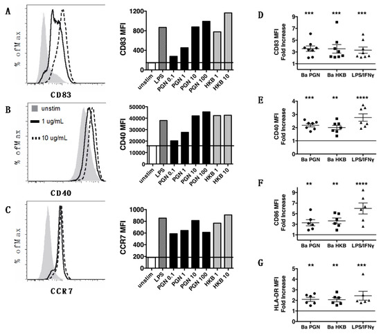 On day 6 after differentiation was initiated, the DCs were harvested, plated at 5 × 105/mL and left unstimulated or stimulated with purified and sonicated PGN (1–100 µg/mL), HKB (1–10 µg/mL PGN equivalents) or LPS (100 ng/mL) + IFNγ (2000 IU/mL) in the presence of 5% pooled human AB serum (Innovative Research Inc). In the preliminary experiments (not shown), we observed reduced DC responses when the human serum was omitted, consistent with our prior work showing the monocyte FcγR-mediated uptake of PGN bound to the anti-PGN antibodies present in human serum [15]. Therefore, pooled human serum that was shown to contain antibodies that bind both sources of PGN [15] was included in the experiments discussed here. After 18 h, the DCs were assessed for changes in cell surface markers using flow cytometry. For the measurement of the secreted cytokines at 24 h after stimulation, DC supernatants were collected from the duplicate wells, each containing 50,000 DCs.