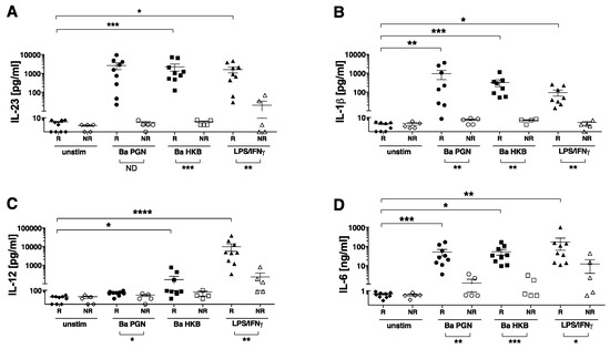 B. anthracis PGN stimulates human DCs to secrete IL-23, IL-6 and IL-1β but not IL-12p70. (A–D) DCs were left unstimulated (unstim) (diamonds) or stimulated for 24 h in duplicate with LPS (100 ng/mL) + IFNγ (2000 IU/mL) (triangles), B. anthracis (Ba) PGN (10 μg/mL) (circles) or B. anthracis HKB (10 µg/mL PGN equivalent) (squares) in the presence of 5% human serum. The cytokines present in cell supernatants were quantified using xMAP multiplex assays. The individual donors were divided into responders (R, closed symbols) and non-responders (NR, open symbols) based on the PGN-induced production of IL-23. The NR were defined as those whose Ba PGN-stimulated DCs produced IL-23 in amounts less than the mean + 3 SD (0.464 + 2.32 pg/mL) of their unstimulated DCs. The mean + SD of the 14 unstimulated samples (all <2 pg/mL) was 0.464 + 0.775; the mean + SD of the 5 NR samples was 0.46 + 0.862 (all <2 pg/mL); and the mean + SD of the 9 R samples was 2642 + 3098 (range 22–9405 pg/mL). Symbols represent the averaged values obtained by assaying duplicate wells for each stimulus of the DCs from individual donors (n = 14). The significance of the differences between the responders (excluding the Ba PGN-induced IL-23 measurement used to define the R and NR groups) was evaluated using a Friedman’s ANOVA of log-transformed data, followed by Dunn’s multiple comparison test to compare the mean of the unstimulated control with each stimulated condition. The significance of the differences between the responders and non-responders for each stimulus (excluding the Ba PGN-induced IL-23 measurement used to define the R and NR groups) was evaluated using a Mann–Whitney test (p-values are indicated below the x-axis). The p-values are indicated by *, p < 0.05; **, p < 0.01; ***, p < 0.001; **** p < 0.0001. ND, not determined.