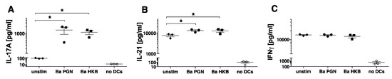 B. anthracis PGN-stimulated DCs induce naïve allogeneic CD4+ T cells to produce IL-17 and IL-21. Isolated allogeneic naïve CD4+ T cells were incubated with DCs that were left unstimulated (unstim) (diamonds) or stimulated for 18 h with B. anthracis (Ba) PGN (10 μg/mL) (circles) or B. anthracis HKB (10 μg/mL PGN equivalents) (squares) in the presence of 5% human serum. T + DC cultures were set up in triplicate, and the control wells contained T cells without DCs. After 7 days, the T cells were restimulated with PDBU/Ionomycin, and 16 h later, the supernatants were collected and assayed for (A) IL-17A, (B) IL-21 and (C) IFNγ using xMAP multiplex assays. The symbols represent the average of the triplicate wells for the individual donors (n = 3). The significance of the differences was evaluated using a one-way ANOVA, followed by a multiple comparison test. The p-values for each T cell response to the stimulated DCs, relative to the T cell response to the unstimulated DCs, are indicated by *, p < 0.05.