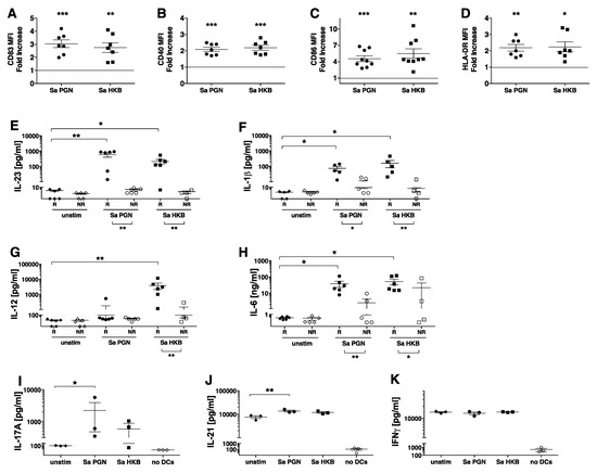 S. aureus PGN stimulates human DC production of IL-23 and IL1β, resulting in their ability to promote naive TH17 differentiation. (A–D) DCs were incubated with S. aureus (Sa) PGN (circles) or HKB (squares) (10 μg/mL). Shown above is the fold increase in (A) CD83, (B) CD40, (C) CD86 and (D) HLA-DR on the DCs exposed to the stimuli indicated on the x-axis, relative to the unstimulated DCs, for which the values were set to 1. For each stimulus, the symbols represent individual donors (n = 7–9), and the mean and SEM are indicated. The significance of the differences was evaluated using a repeated measure one-way ANOVA followed by Tukey’s multiple comparison test to compare the mean of the response of the unstimulated DCs with the response of the stimulated DCs. (E–H) DCs were left unstimulated (unstim) (diamonds) or stimulated for 24 h with Sa PGN (10 μg/mL) (circles) or HKB (10 μg/mL PGN equivalent) (squares) in the presence of 5% human serum. The cytokines, including (E) IL-23 (F) IL-1β (G) IL-12p70 and (H) IL-6, present in the cell supernatants were quantified using xMAP multiplex assays. The individual donors were divided into responders (R, closed symbols) and non-responders (NR, open symbols) based on the Ba PGN-induced production of IL-23, as described in Figure 2. The symbols represent the averaged values obtained by assaying duplicate wells for each stimulus of the DCs from individual donors (n = 10). The significance of the differences between the responders was evaluated using a Friedman’s ANOVA of log-transformed data followed by Dunn’s multiple comparison test to compare the mean of the unstimulated control with each stimulated condition. The significance of the differences between the responders and non-responders for each stimulus was evaluated using a Mann–Whitney test (p-values are indicated below the x-axis). (I–K) Isolated allogeneic naïve CD4+ T cells were incubated with the DCs that were left unstimulated (unstim) (diamonds) or stimulated for 18 h with Sa PGN (10 μg/mL) (closed circles) or HKB (10 μg/mL PGN equivalent) (squares) in the presence of 5% human serum. T + DC cultures were set up in triplicate, and the control wells contained T cells without DCs (open circles). After 7 days, the T cells were restimulated with PDBU/Ionomycin, and 16 h later, the supernatants were collected and assayed for (I) IL-17A, (J) IL-21 and (K) IFNγ using xMAP multiplex assays. The symbols represent the average of the triplicate wells for the individual donors (n = 3). The significance of the differences was evaluated using a one-way ANOVA followed by a multiple comparison test to compare the mean of the response to the unstimulated DCs with the response to the stimulated DCs. In all the panels, the p-values are indicated by *, p < 0.05; **, p < 0.01; ***, p < 0.001.