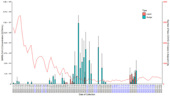 SARS-CoV-2 concentration in the liquid fraction (pink bar) and sludge fraction (green bar) of the tank wastewater from the meat processing plant from 11 January 2022 to 3 April 2022. The dates where wastewater was not collected are marked in blue. SARS-CoV-2 quantification results were obtained from qRT-PCR analysis with conversion from Ct values to GCN/mL based on the standard curve. The number of new clinically diagnosed COVID-19 cases on each date in the adjacent city area during the wastewater collection period is shown by the red curve.