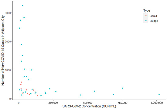 Figure 2 shows the SARS-CoV-2 concentration (GCN/mL) from the positive wastewater in the liquid and sludge fraction and the number of new COVID-19 cases in adjacent city on the collection date. This distribution of data is right skewed as six positive wastewater samples with virus concentration greater than 250,000 GCN/mL were from dates where the number of new COVID-19 cases were low. These observations with high SARS-CoV-2 contents and low number of new COVID-19 cases were likely contributed by the continuous detection of positive wastewater sludge from mid-February. Overall, the correlation between SARS-CoV-2 contents and new COVID-19 cases was poor, if any. A Pearson’s correlation coefficient analysis was performed and showed that the correlation between SARS-CoV-2 concentrations in wastewater and the new COVID-19 cases in an adjacent city during the collection period failed to return a significant p-value (p-value = 0.07). The correlation is therefore not statistically significant at 5% level and there is no evidence that any correlation exists. This was expected because the wastewater was collected directly on site of the meat processing plant, and the publicly available COVID-19 information was extracted from the government website where the smallest scale of testing results was the city level. Although the workers at the meat processing plant live in the adjacent city or communities whose COVID-19 testing information was included in the database used in this study, the city population is much larger than the workers alone and may not closely reflect the situation in the meat processing plant.