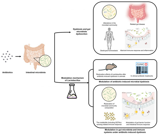 Here, we have highlighted the effect of antibiotic exposure in the disruption of commensal communities, and the resulting decreased interactions between gut microbiota and the mucosa. Based on a number of studies, we summarized the alteration of the appropriate metabolites and functional immune system in a host with antibiotic-induced dysbiosis. The antibiotic treatment has long- or short-lasting perturbations in microbiota that result in the potential risk of diseases including gut disorders, metabolic syndromes and immune-related defects. Therefore, treatments of Lactobacillus aimed at restoring the microbial community and gut barrier integrity are likely to directly reshape the gut ecosystem. Instead, we believe that intestinal metabolic alterations involving the consideration of SCFAs, immune regulatory factors and signaling receptors are more likely to show positive results in Lactobacillus-involved antibiotic dysbiosis regulation. However, we urgently need alternative strategies that substitute or supplement the currently widespread use of antibiotics.