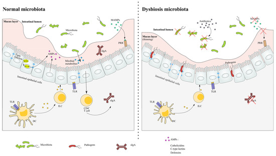- In antibiotic-induced dysbiosis, the numbers of MAMPs are decreased as a result of the loss of microbiota, and the thinned mucus layer and damaged tight junction proteins lead to the infection of opportunistic pathogens. The levels of SCFA and related immune functions are altered after antibiotic exposure.