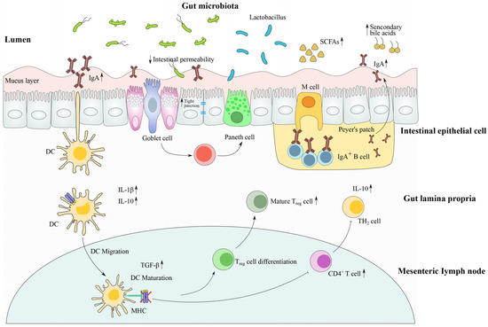 Moreover, the regulation of Treg expression induction through CD4+Foxp3+ T cell differentiation has been revealed by Lactobacillus strains, which suggests the importance of Treg cells in maintaining gut homeostasis. Relevantly, antibiotic-induced gut barrier disruption accelerated the translocation of pathogen evasion, and therefore increased pathoadaptive mutations of commensal intestinal microbiome genes and resulted in infective immune responses or bacterial dissemination [102]. Lactobacillus species targeted regulated immunity cytokines and suppressed the potential invasion of pathogenic bacteria, which created a new strategy for restoring the pathways of beneficial species.