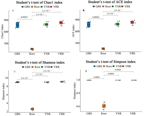Alpha diversity indices of bacteria among different species. (a) Chao1; (b) ACE; (c) Shannon; (d) Simpson. Root: root endophytes bacteria samples of P. hysterophorus; YRR: the rhizosphere soil bacteria samples of P. hysterophorus; YNR: the bulk soils bacteria samples of P. hysterophorus; GBS: the soil bacteria samples of native plants were numbered GBS group.