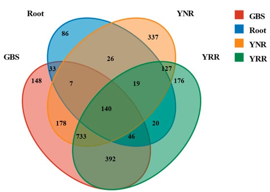In the present study, 1653 OTUs were identified in the YRR group; 1567 OTUs were identified in the YNR group; 1677 OTUs were identified in the GBS group; 377 OTUs were identified in the root group (Figure 2). A total of 2468 bacterial OTUs were obtained from different groups among which 140 were observed in all the groups; 1019 OTUs were shared by YNR and YRR groups; 1311 OTUs were shared by YRR and GBS groups; and 1083 OTUs were shared by YNR and GBS groups. The number of OTUs specific to rhizosphere and non-rhizosphere soil bacteria was higher than that of root bacteria.