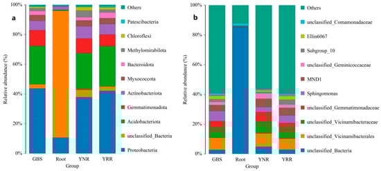 The relative abundance of the top 10 bacterial communities. (a) at the phylum levels; (b) at the genus levels. Root: root endophytes bacteria samples of P. hysterophorus; YRR: the rhizosphere soil bacteria samples of P. hysterophorus; YNR: the bulk soils bacteria samples of P. hysterophorus; GBS: the soil bacteria samples of native plants were numbered GBS group.