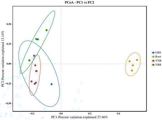 PCoA analysis can intuitively reflect the differences or similarities among different groups. Our results showed that the contribution rates of PC1 and PC2 were 27.46% and 13.14%, respectively (Figure 4). The distance between the bacterial communities in the rhizosphere soil of P. hysterophorus is relatively close, indicating their community composition is similar. In contrast, the root bacterial communities are more dispersed, meaning their community composition is quite different, and the community similarity is low. The comparison shows that the distribution distances of communities are quite different, indicating significant differences in the composition of the rhizosphere and root-soil bacterial communities of P. hysterophorus.