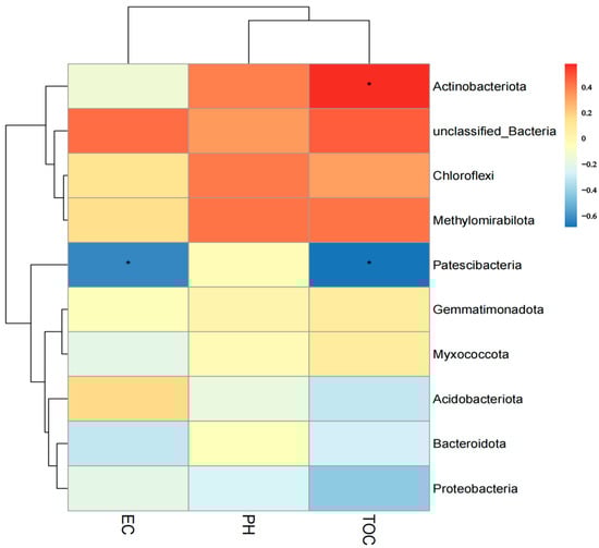 The results show that different environmental factors have other effects on soil microorganisms. The bacterial phyla in relative abundance and the soil physicochemical factors of pH, TOC, and EC were used as parameters, respectively. Our results showed that the Patescibacteria was correlated with the TOC and EC, and the Acitinobacteriota was correlated with the TOC (Figure 5).