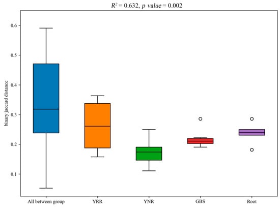 PERMANOVA analysis among different species. Root: root endophytes bacteria samples of P. hysterophorus; YRR: the rhizosphere soil bacteria samples of P. hysterophorus; YNR: the bulk soils bacteria samples of P. hysterophorus; GBS: the soil bacteria samples of native plants were numbered GBS group.