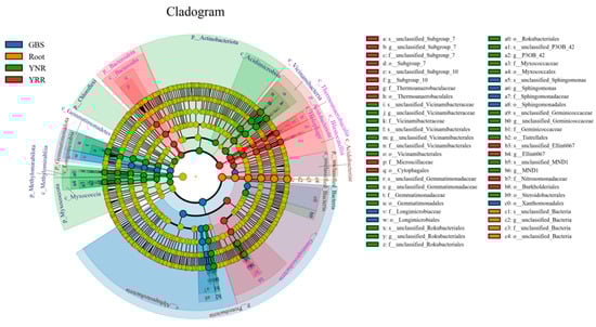 The LEfSe can find biomarkers with statistical differences between different groups. Our results showed that the Acidobacteriota and Bacteroidota (at the phylum level) and the Subgroup_10 and Ellin6067 (at the genus level) played essential roles in the YRR group (Figure 7). The Actinobacteriota, Methylomirabilota, Myxococcota and Chloroflexi (at the phylum level), and the MND1 and P3OB_42 (at the genus level) played an essential role in the YNR group. The Proteobacteria and Gemmatimonadota (at the phylum level), and the Sphingomonas (at the genus level) were playing an essential role in GBS groups.
