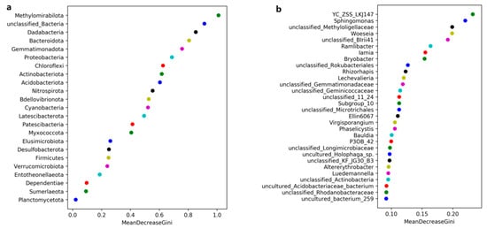 Random forest analyses among different species. Random forest is a subclass of ensemble learning, which depends on the voting choices of decision trees to determine the final classification results. Different colors mean different bacterial species. (a) at the phylum levels; (b) at the genus levels.