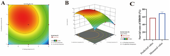 Effects of pre−freezing temperature and sublimation temperature on the survival rates of Bifidobacterium longum BB68S after freeze-drying process. (A) Contour; (B) 3D Surface; (C) Predicted values and measured values for survival rates of BB68S under optimal conditions.