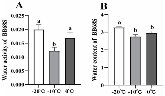 The water content and aw of BB68S under different sublimation temperatures are shown in Figure 3. The lowest water content and aw of BB68S were obtained under the condition of sublimation temperature of −10 °C (p < 0.05).