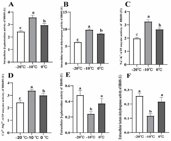 Intracellular β−galactosidase (A), intracellular lactate dehydrogenase (B), Na+-K+-ATP (C), Ca2+-Mg2+-ATP (D), extracellular β-galactosidase (E) and extracellular lactate dehydrogenase (F) activities of Bifidobacterium longum BB68S exposed to various sublimation temperatures. Different letters indicate significant differences (p < 0.05).