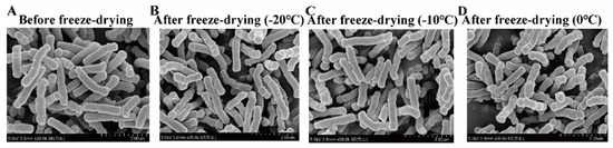 Scanning electron microscope photographs of Bifidobacterium longum BB68S exposed to various sublimation temperatures.