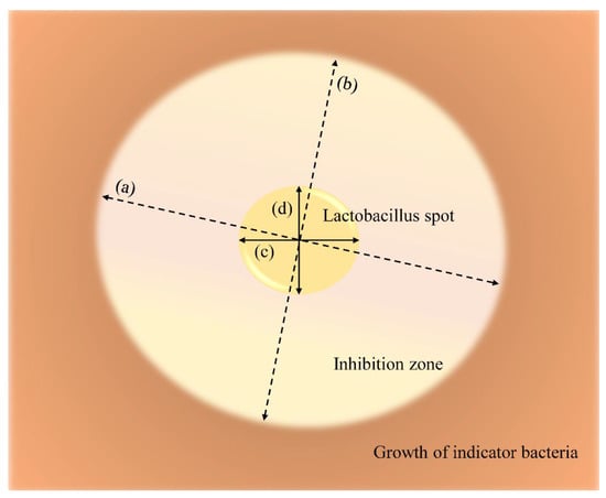 The definition of spot inhibition index (SII) and calculation method: (a) longest diameter of inhibitory zone, (b) shortest diameter of inhibitory zone, (c) longest diameter of lactobacillus spot, and (d) shortest diameter of lactobacillus spot. Each SII of lactobacillus was calculated as follows: Spot Inhibition Index (SII) = [M1] .