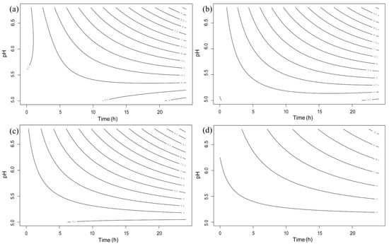 Fitted response-surface contour plots for the effect of pH and incubation time against the growth of four indicator bacteria: (a) SG: Salmonella gallinarum CNHJ001, (b) SE: Salmonella enteritidis 190610_1, (c) EC: Escherichia coli ROH_0034, and (d) SA: Staphylococcus aureus ROH_0029.