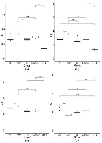 Differences in spot inhibition index (SII) values of the three lactobacilli and two antibiotics against the indicator bacteria: (a) Salmonella gallinarum CNHJ001, (b) Salmonella enteritidis 190610_1, (c) Escherichia coli ROH_0034, and (d) Staphylococcus aureus ROH_0029. The SII of each lactobacillus and antibiotic was calculated from ten replicates. The SII values of all groups were analyzed using a Kruskal–Wallis test followed by Dunn’s test for post hoc testing. Significant difference is denoted by asterisk * (*: p < 0.05, **: p < 0.01, ***: p < 0.001, ****: p < 0.0001). AK: amikacin; AMP: ampicillin; LP: L. plantarum ATCC 14917; L.SWLA-1: L. animalis SWLA-1; L11-2: L. animalis 11-2.