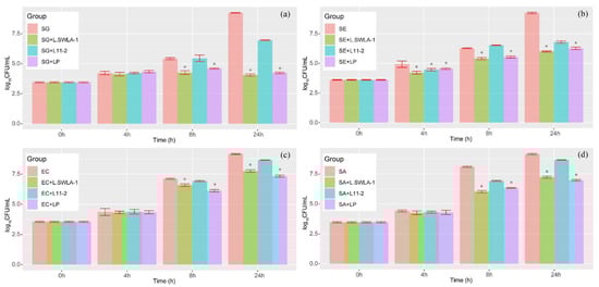 The results of the four indicator bacteria cocultured with each lactobacillus strain at each time point. Indicator bacterial strains are (a) SG: Salmonella gallinarum CNHJ001, (b) SE: Salmonella enteritidis 190610_1, (c) EC: Escherichia coli ROH_0034, and (d) SA: Staphylococcus aureus ROH_0029. The lactobacillus strains are L.SWLA-1: L. animalis SWLA-1, LP: L. plantarum ATCC 14917, and L11-2: L. animalis 11-2. Significant difference is denoted by asterisk * (p < 0.05).