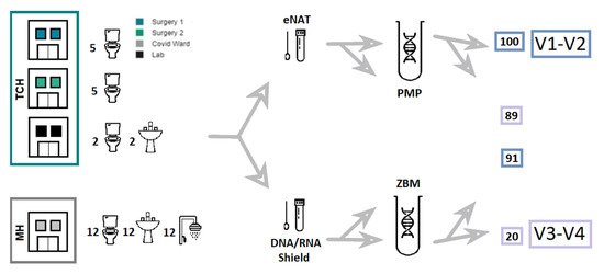 Neidhöfer, C.; Sib, E.; Benhsain, A.-H.; Mutschnik-Raab, C.; Schwabe, A.; Wollkopf, A.; Wetzig, N.; Sieber, M.A.; Thiele, R.; Döhla, M.; et al. Examining Different Analysis Protocols Targeting Hospital Sanitary Facility Microbiomes. Microorganisms 2023, 11, 185. https://doi.org/10.3390/microorganisms11010185