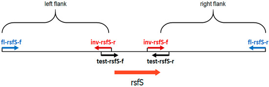 The layout of primers used in this study. fl-rsfS-f/fl-rsfS-f (blue). fl-rsfS fragments primers and inv-rsfS-f/inv-rsfS-r (red), the primers for pUC19 synthesis. flΔrsfS, and test-rsfS-f/test-rsfS-r (black), the primers for test PCR. Arrows indicate the direction of nucleotide chain synthesis.