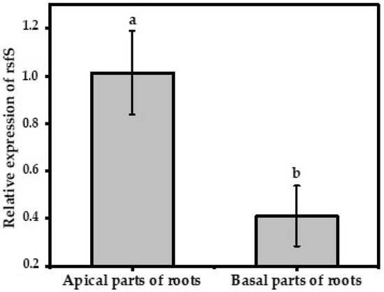 An RT-qPCR-based comparison of the relative rsfS gene expression in P. putida PCL1760 under the colonization of tomato root parts. Data are represented as mean ± SD. The significant difference between bacterial strains was evaluated using one-way ANOVA and post hoc Tukey’s honestly significant difference test at a p-value ≤ 0.01. Significant difference among groups is labeled with different letters (a and b).