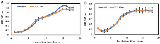 The growth curve of SB9 and PCL1760 is represented in Figure 4A (in a rich nutrient medium, LB) and Figure 4B (basal medium). The obtained result revealed that the growth rate of SB9 was almost identical to PCL1760 in both rich and basal media. The lagging growth phase of SB9 and PCL1760 was immediately observed after two hours of incubation in a rich LB medium (Figure 4A) and four hours in a basal medium (Figure 4B). Their average optical density in the lagging phase was 0.15 ± 0.02 and 0.14 ± 0.02 in the LB medium, and 0.15 ± 0.025 and 0.14 ± 0.015 in the basal medium. However, after six hours of incubation (the beginning of the stationary phase), a statistical difference (p ≤ 0.05) between SB9 and PCL1760 was observed (Figure 4A). The OD595 of SB9 during this incubation period ranged from 0.976 ± 0.013 to 1.22 ± 0.02, while the OD595 of PCL1760 reached from 0.85 ± 0.02 to 1.13 ± 0.03.