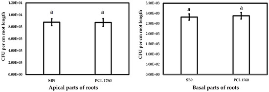 The ability of SB9 compared to its wild type strain PCL1760 to colonize the roots of tomato plants is shown in Figure 5 (inoculated separately) and Figure 6 (combined). The results revealed that in a non-competitive environment, the colonizing ability of the mutant statistically (p ≤ 0.05) did not differ from its wild type strain PCL1760 (Figure 5). The average population was almost at the same level on the basal and apical parts of the root. The colony-forming unit of SB9 and PCL1760 per centimeter (CFU/cm) root length on the basal part was 2.82 × 103 ± 0.15 × 103 and 2.88 × 103 ± 0.08 × 103 whereas, on the apical part of the root, the population was counted as 8.78 × 103 ± 0.6 × 103 and 8.73 × 103 ± 0.9 × 103, respectively.