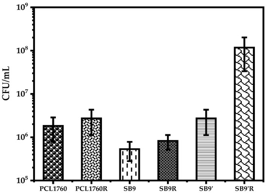 The remaining cell subpopulation of SB9 was up to 221.07 times less than SB9’R. The generation of the persistent cell of PCL1760, the L-rhamnose pretreated strain PCL1760 (WTR), the L-rhamnose pretreated strain SB9 (SB9R), and the complementary strain of SB9 (SB9’) was individually up to 64.43, 43.15, 143.19, and 43.15 times less persistent than SB9’R, (Figure 7). The colony-forming units per milliliter of PCL1760, PCL176R, SB9, SB9R, SB9’, and SB9’R after starvation were estimated as 1.82 × 106, 2.72 × 106, 5.31 × 105, 8.2 × 105, 2.72 × 106, and 1.17 × 108, respectively.