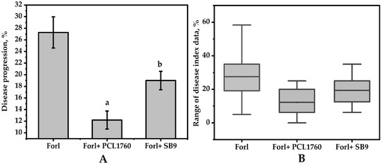 Biocontrol properties of P. putida SB9 in the suppression of tomato foot and root disease caused by Forl ZUM2407. (A) Disease index of each group (data are represented as mean ± SD) and (B) the range of the disease index data of tomato plants. Significant difference among groups at a p-value ≤ 0.05 is labeled with different letters (a and b).