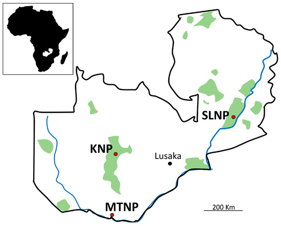 Map of sample collection sites. Capital city and sampling sites are displayed in black and red points. MTNP: Mosi-oa-Tunya National Park, KNP: Kafue National Park, SLNP: South Luangwa National Park.