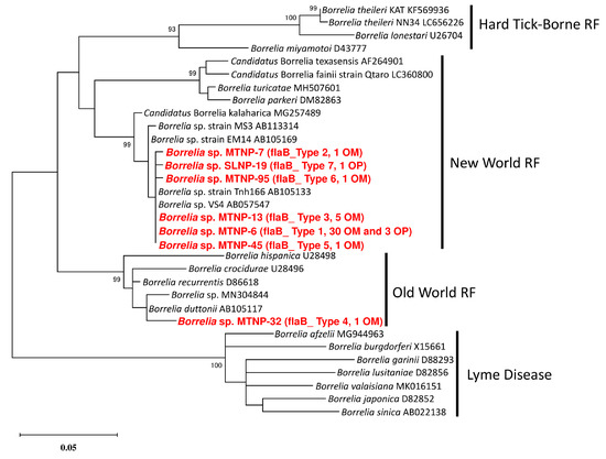 The vector-borne spirochetes of the family Borreliaceae currently comprise 42 named species [1]. Their natural transmission cycle is maintained between vertebrate reservoir hosts such as rodents and humans and vector arthropods such as ticks and lice. The Borrelia phylogenetic groups include Lyme disease (LD) borreliae, relapsing fever (RF) borreliae, monotreme-associated borreliae, and reptile-associated borreliae [2,3,4]. LD borreliae, monotreme-associated borreliae, and reptile-associated borreliae are transmitted by Ixodid (hard-bodied) ticks. RF borreliae are transmitted mainly by lice and Argasid (soft-bodied) ticks [5]. RF borreliae are further categorized into Old World (Afrotropic-Palearctic Ecozones) RF borreliae, New World (Nearctic Ecozone) RF borreliae, and hard tick-borne RF borreliae. They are distinguished by their endemic regions and/or the genetic lineages of the causative agents [5,6].