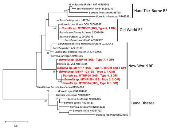 Phylogenetic tree of the Borrelia spp. based on 1355 bp of 16S ribosomal DNA sequences. The analyses were performed by the ML method with the Kimura-2 parameter. The sequences generated herein are displayed in bold and red font. The 16S rDNA sequence types and the numbers of samples with the same sequence are enclosed in brackets. OM and OP refer to Ornithodoros moubata and O. porcinus, respectively. Bootstrap values > 70% are based on 1000 replications and are shown beside the branches.